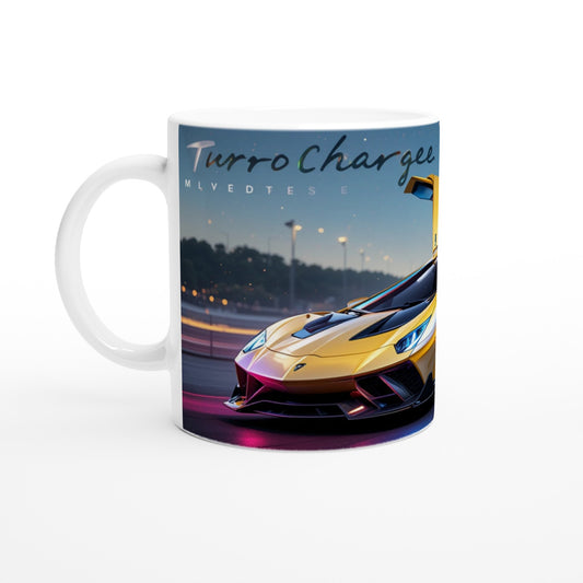 Sports Car Design Ceramic Coffee Mug – 11oz Glossy White with Colored Accents